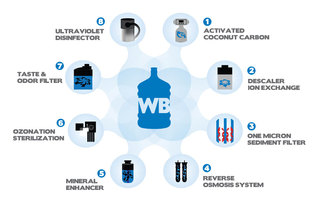 Our system includes carbon filtration, fine sediment filtration, reverse osmosis, mineral enhancement and final disinfection steps to ensure consistent quality with every refill.